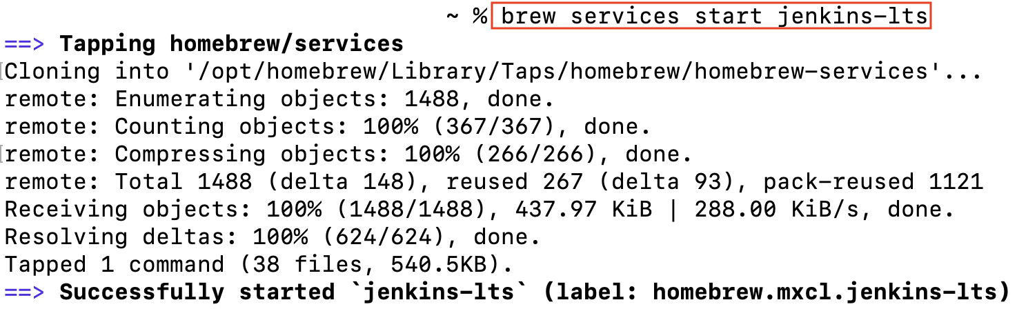 5. 앞의 jenkins-lts 실행 명령어를 실행시켰을 때 brew-services와 관련한 패키지 설치되어 있지 않으면 다음과 같은 github repository에 저장된 brew-services 관련 소프트웨어를 clone한 후 jenkins-lts를 실행시킨다.