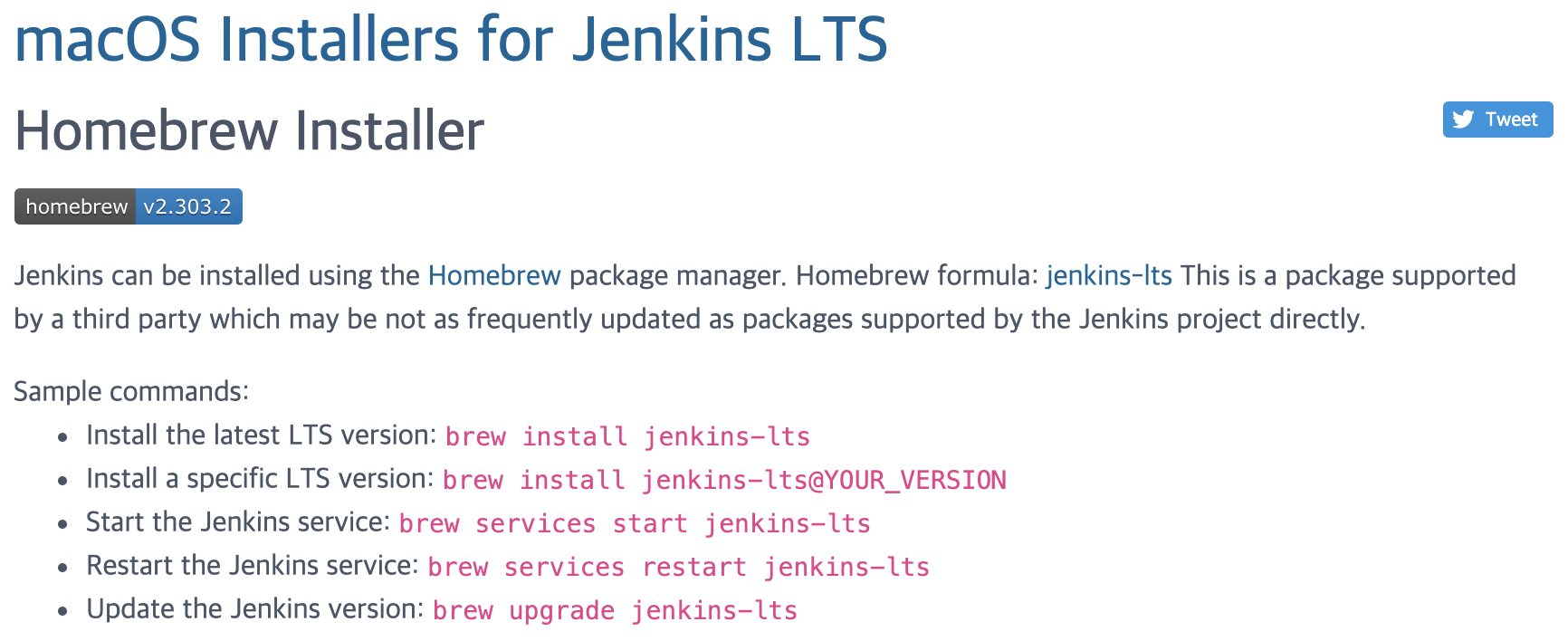 2. Jenkins 다운로드 링크에는 LTS(Long-Term Support)인 안정된(Stable) 버전과 주 단위로 정기적으로 배포되는 버전이 있다. 설치는 MacOS의 패키지 매니저인 brew를 사용할 것을 권하고 있다.