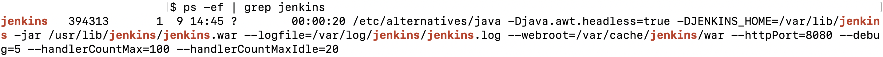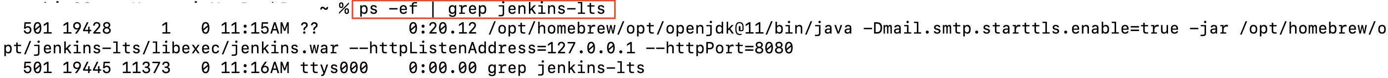 6. jenkins-lts 가 실행되었는지 확인하기 위해 다음의 명령어를 이용하여 현재 실행 중인 프로세스를 확인하여 실행되고 있음을 확인한다.