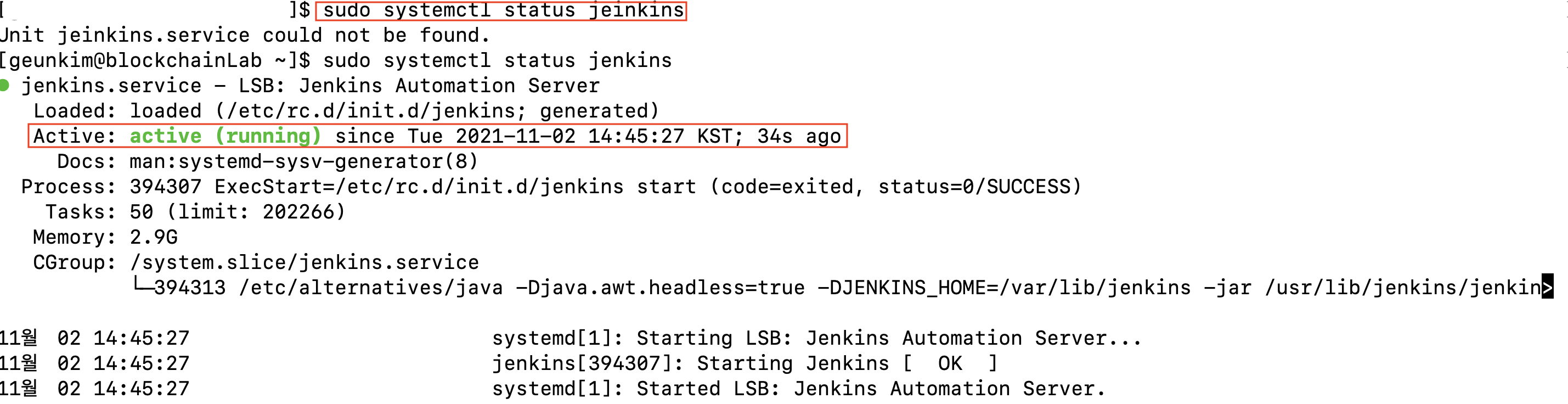 (4) Jenkins service의 상태 정보는 다음 명령어를 통해 얻을 수 있다.