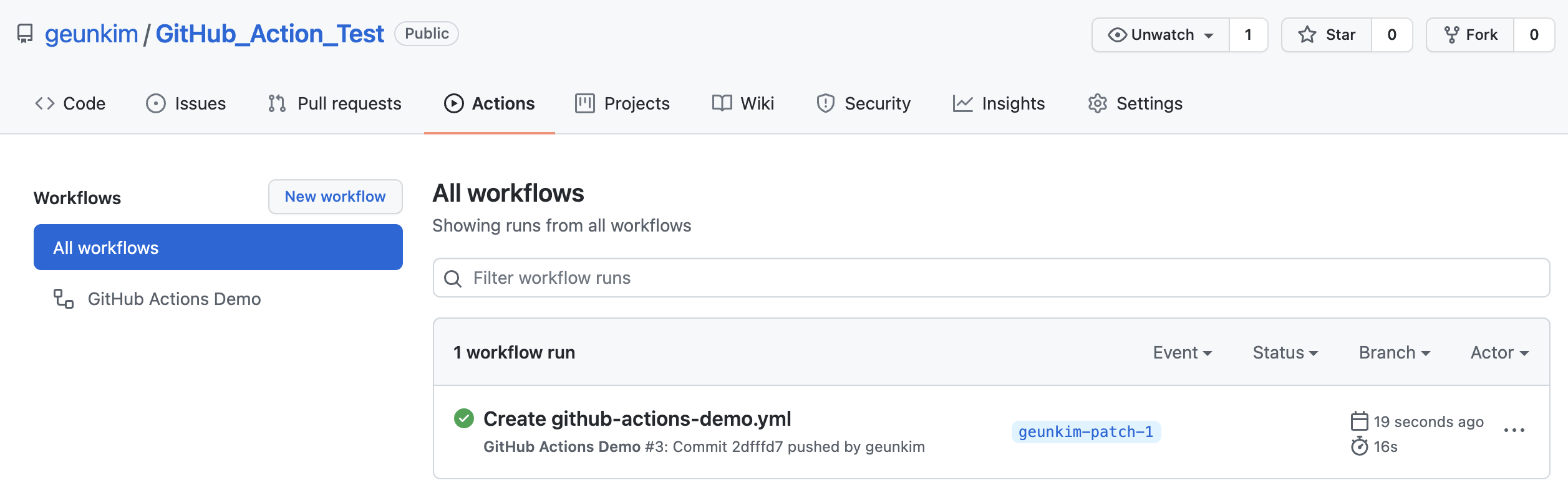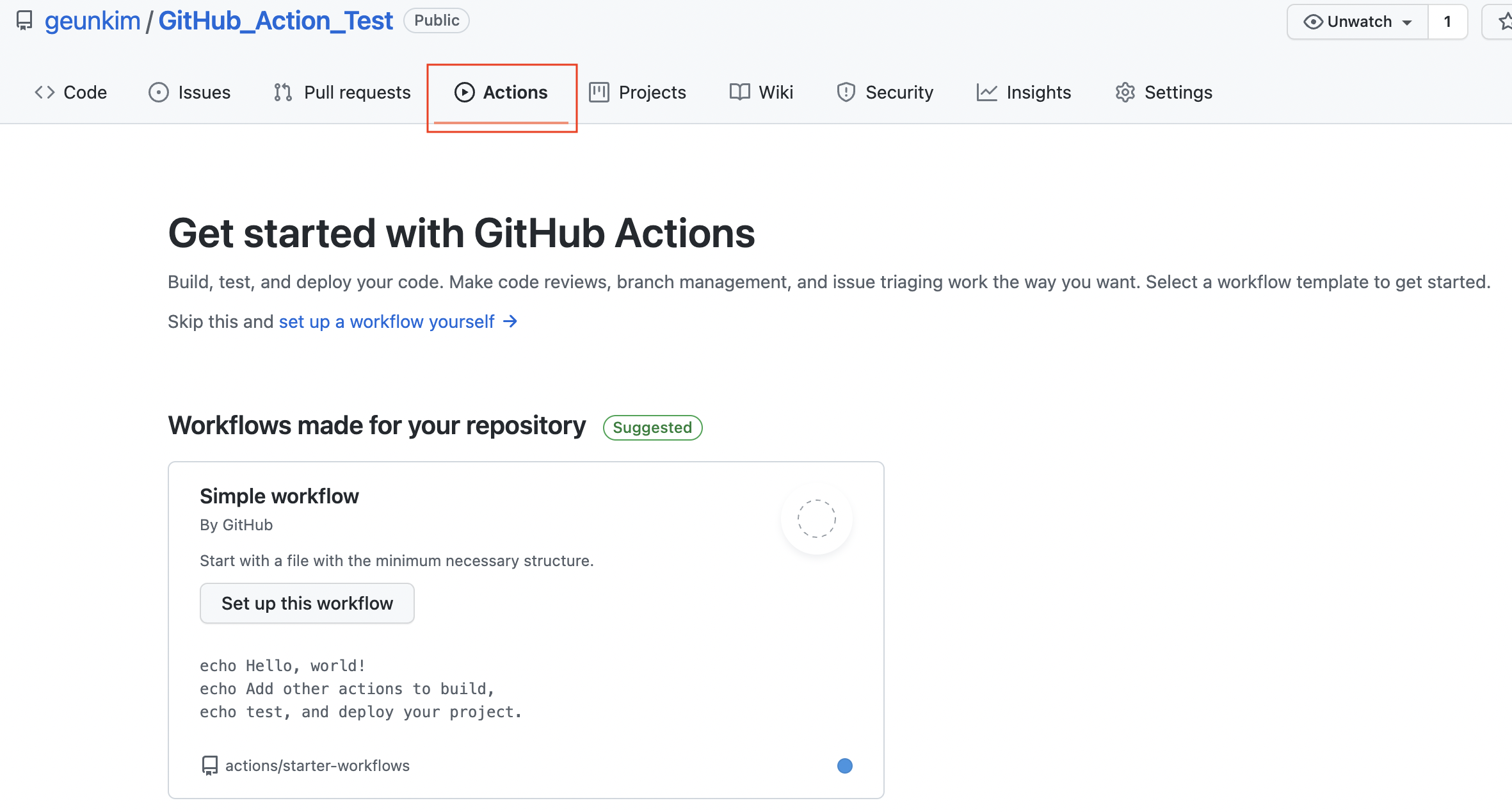(2) Actions페이지에 새로운 워크플로우가 만들어졌음을 확인할 수 있다.