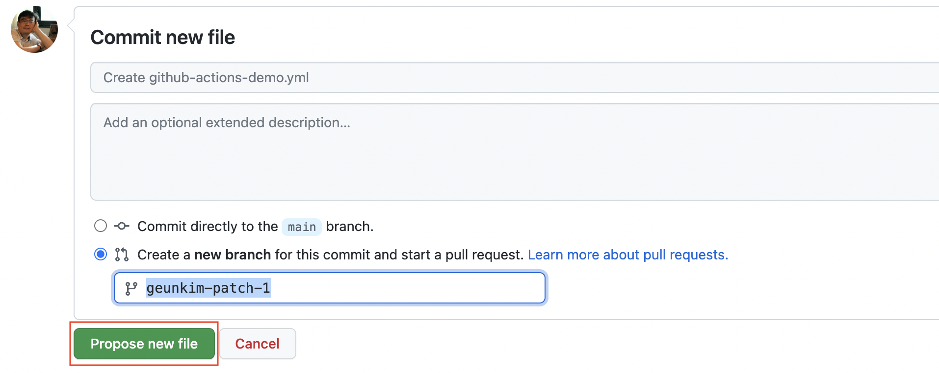 (4) 페이지의 아래로 이동한 후 Create a new branch for this commit and start a pull request 메뉴를 선택한 후 새로운 branch를 생성하고 Propose new file을 클릭한다.