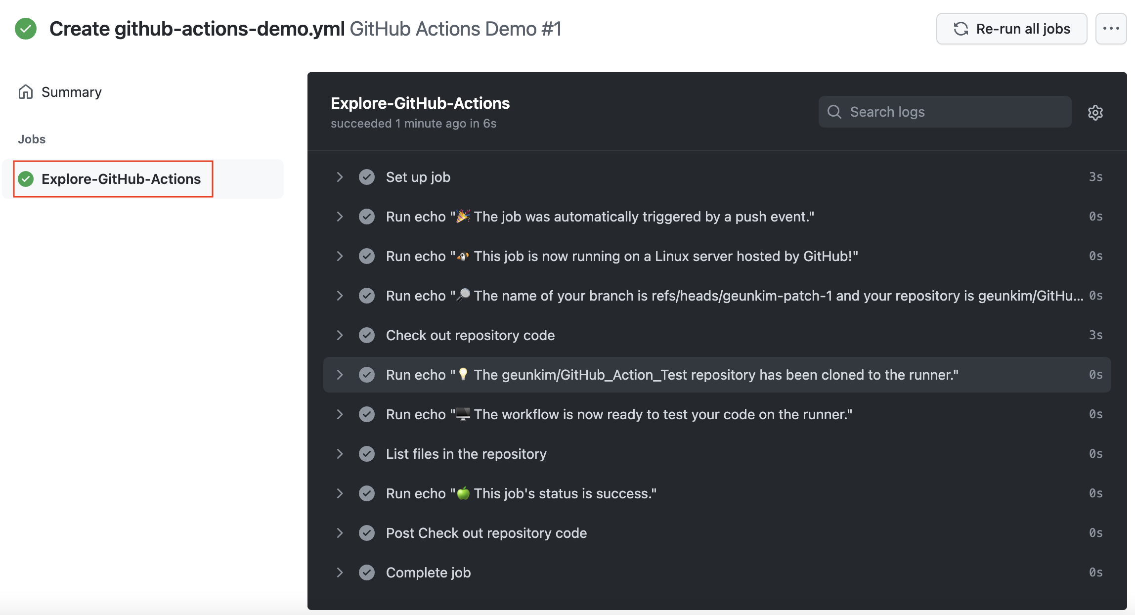 (4) 워크플로우 실행 목록에서 확인하려는 실행 이름을 클릭하면 github-actions-demo.yml 파일을 실행한 결과를 확인할 수 있다.