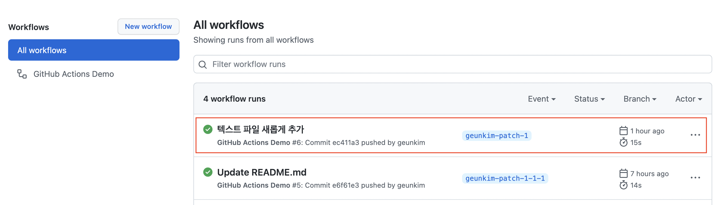 GitHub Actions Demo워크플로우만 존재하고 있는 상태이다.