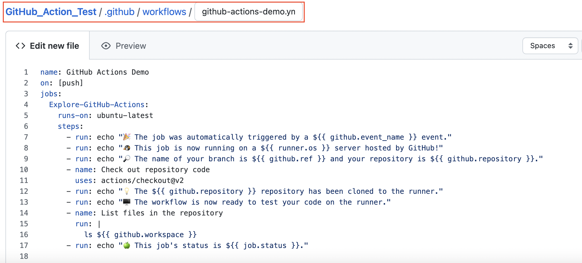 (3) 다음의 YAML 형식을 적상된 내용을 github-actions-demo.yml 파일에 복사한다.