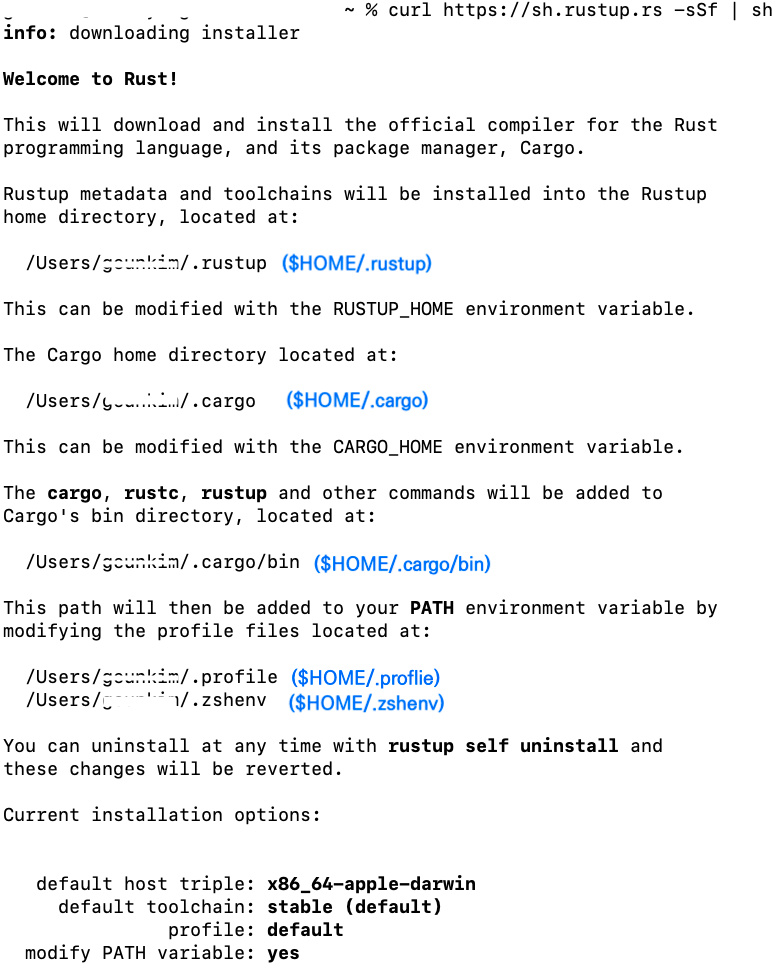 이 명령어를 실행하면 Rust 언어의 공식적인 컴파일러와 패키지 관리자 Cargo를 다운로드하고 설치한다. $HOME 디렉토리에 Rusup 홈 디렉토리($HOME/.rustup), Cargo 홈 디렉토리($HOEM/.cargo), cargo, rustc, rustup 실행파일은 $HOME/.cargo/bin 디렉토리에 설치된다.