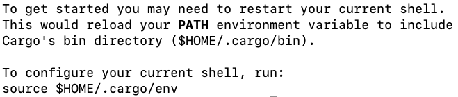 터미널을 재 실행시키면 시스템의 PATH 환경 변수에 $HOME/.cargo/bin 디렉토리가 추기된다. 터미널을 재 실행시키지 않고 환경 변수를 설졍하기 위해서 다음 명령어를 실행힌다.