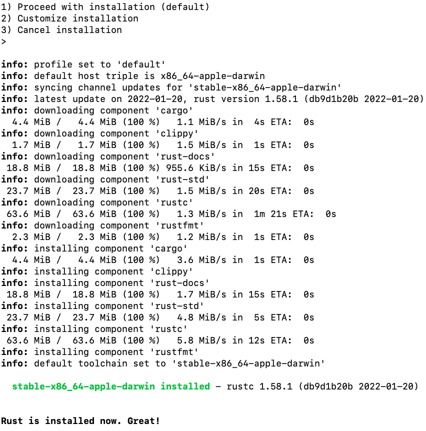 아래와 같이 설치 옵션이 화면에 출력된다. 디폴트 설치를 선택하면 'cargo', 'clippy', 'rust-doc', 'rust-std', 'rustc', 'rustfmt', 'cargo', 컴포넌트를 설치한다. rustc 버전 1.58.1 이 설치되었다.